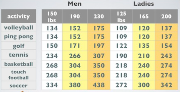 The next set of ways for burning calories is by signing up for different sports and teams. The chart above lists a couple of sports and the number of calories each sport burns based on your body weight. It is important to note that other sports such as hockey, soccer, and even swimming will make you burn a lot more calories as these sports require you to constantly move all of your body parts for long periods of time as opposed to golf or volleyball.